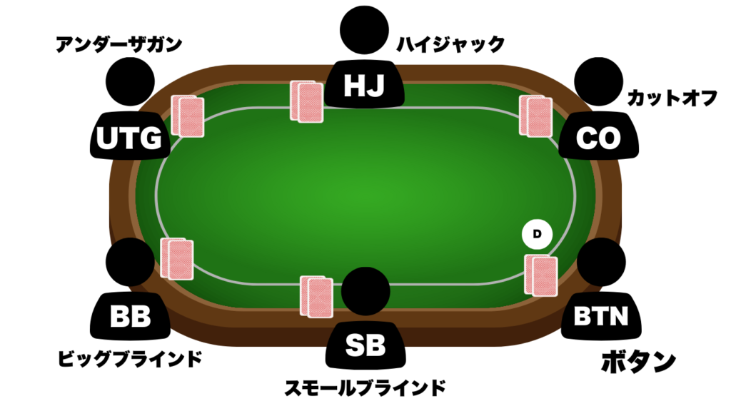 ポジション(Position)とは、テーブル上の自分の座っている位置のことです。 ポーカーでは、自分のポジションが非常に重要で、勝率にも大きく影響します。